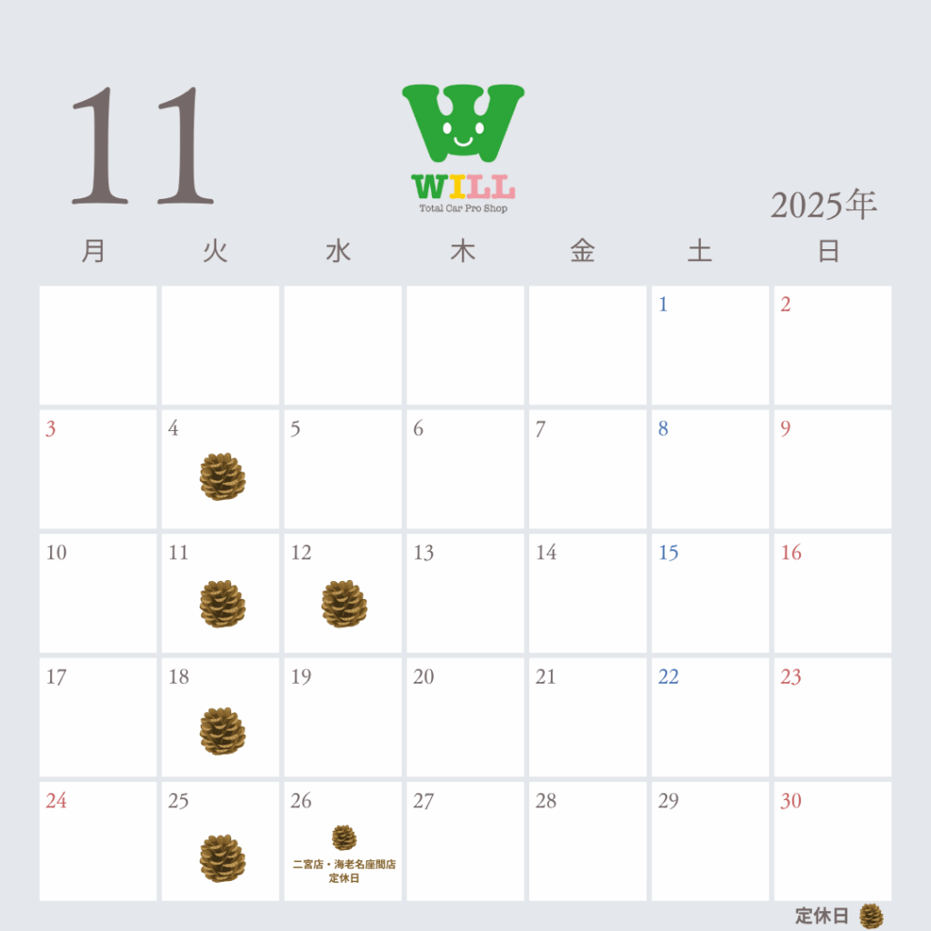 カーショップWILLは毎週火曜日と第二水曜日が定休日となっております。